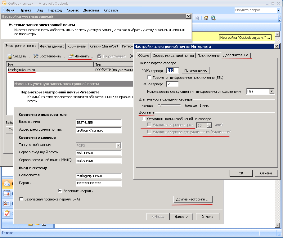 Пример настройки квот в почтовом клиенте Microsoft-outlook при использование протокола POP3