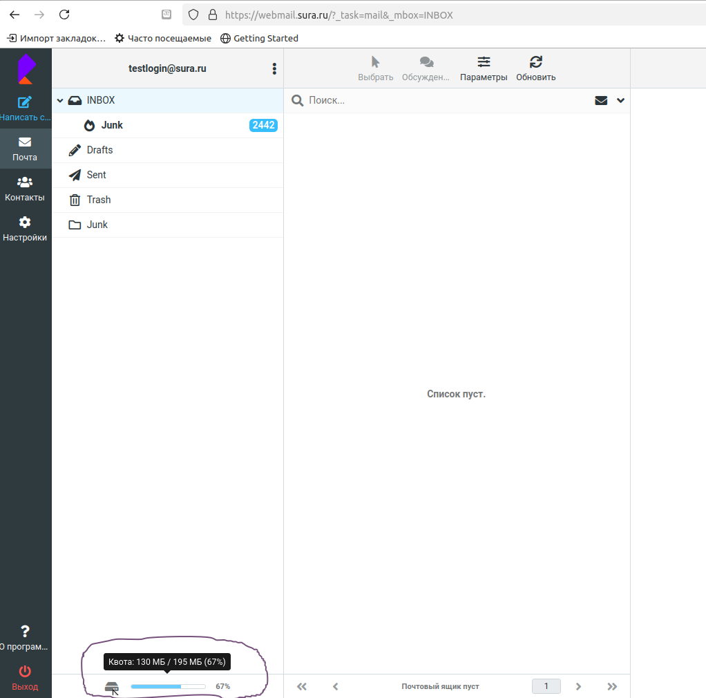 Состояние прогресса заполненности электронного почтового ящика можно увидеть в левом нижнем углу