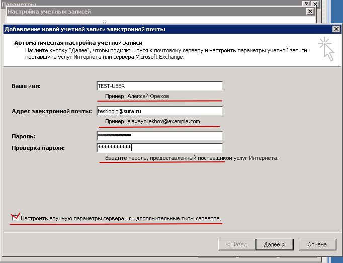 | Адрес электронный почты | Имя почтового ящика, включая логин, @ и домен от вашей почты На пример: username@domain.ru @domain.ru - домен вашей почты, например @samtel.ru |
