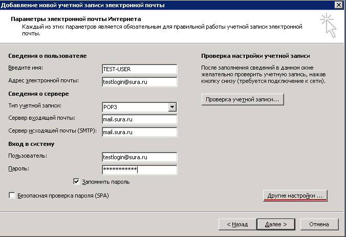 | Сервер входящей почты (POP3, IMAP сервер) | mail.samtel.ru |